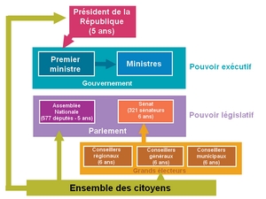 • il est constitué de l'Assemblée nationale (les députés élus au suffrage universel direct) et le Sénat (les sénateurs élus au suffrage universel indirect).